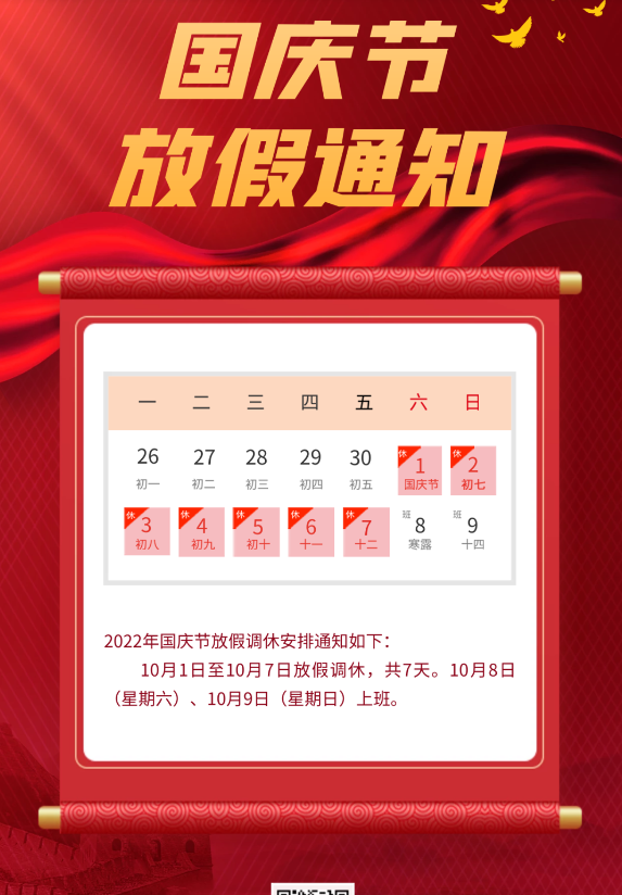 根據(jù)《國(guó)務(wù)院辦公廳關(guān)于2022年部分節(jié)假日安排的通知》(國(guó)辦發(fā)明電〔2021〕11號(hào))精神,現(xiàn)將2022年國(guó)慶節(jié)放假調(diào)休安排通知如下:10月1日至10月7日放假調(diào)休,共7天。10月8日(星期六)、10月9日(星期日)上班。