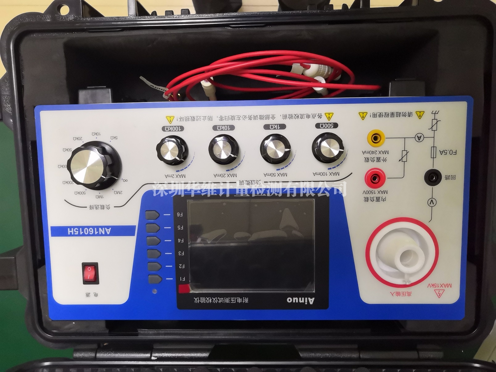 將絕緣電阻測(cè)試儀兩個(gè)測(cè)試夾夾住兩個(gè)接線柱,加500V直流電壓,觀察儀器的絕緣電阻顯示值是否為500M ,如果電阻顯示500M ,則儀器功能正常,反之不合格