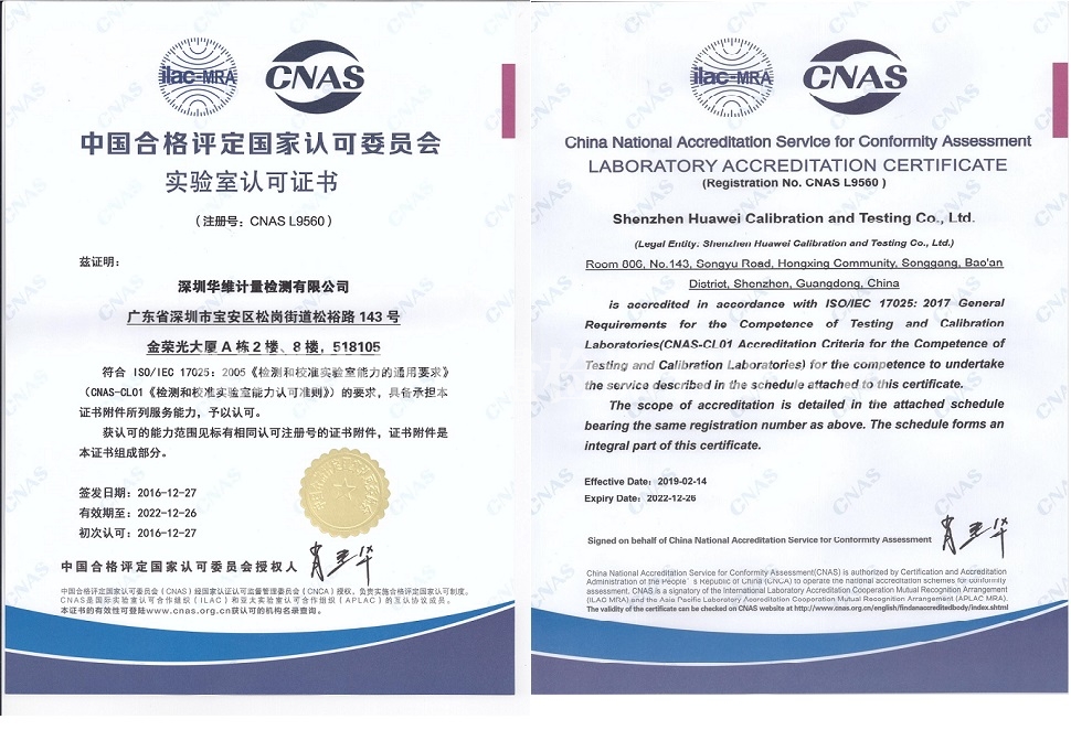 華維計(jì)量(深圳儀器校準(zhǔn)專家),作為獨(dú)立第三方的專業(yè)計(jì)量校準(zhǔn)服務(wù)提供商,儀器校準(zhǔn)_計(jì)量檢測(cè)_計(jì)量校正_儀器校正首選CNAS實(shí)驗(yàn)室認(rèn)可校準(zhǔn)機(jī)構(gòu).華維計(jì)量_深圳儀器校準(zhǔn)核心開(kāi)展電學(xué)、無(wú)線電、理化、長(zhǎng)度、力學(xué)、熱工等領(lǐng)域的計(jì)量校準(zhǔn)業(yè)務(wù),為廣大客戶在測(cè)量準(zhǔn)確、量值溯源及品質(zhì)保證方面提供了強(qiáng)有力支撐。公司計(jì)量校準(zhǔn)實(shí)驗(yàn)室嚴(yán)格按照ISO17025質(zhì)量管理體系建立和運(yùn)營(yíng),編號(hào)為:CNAS L9560。另外,公司已獲得中國(guó)合格評(píng)定國(guó)家認(rèn)可委員會(huì)頒發(fā)的《實(shí)驗(yàn)室認(rèn)可證書》和廣東省質(zhì)量技術(shù)監(jiān)督局頒發(fā)的《計(jì)量校準(zhǔn)機(jī)構(gòu)備案證書》以及獲得深圳市行政主管部門頒發(fā)的22個(gè)《計(jì)量標(biāo)準(zhǔn)考核證書》!